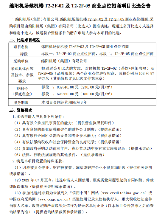 綿陽機場候機樓 T2-2F-02及T2-2F-05 商業(yè)點位招商項目比選公告